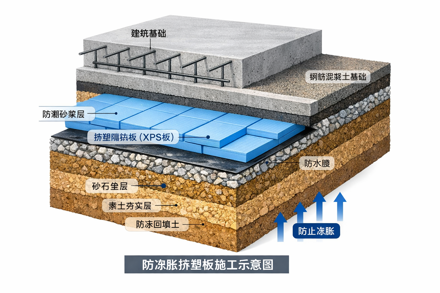 主要作用:保溫隔熱,防止地基土受凍脹起拱